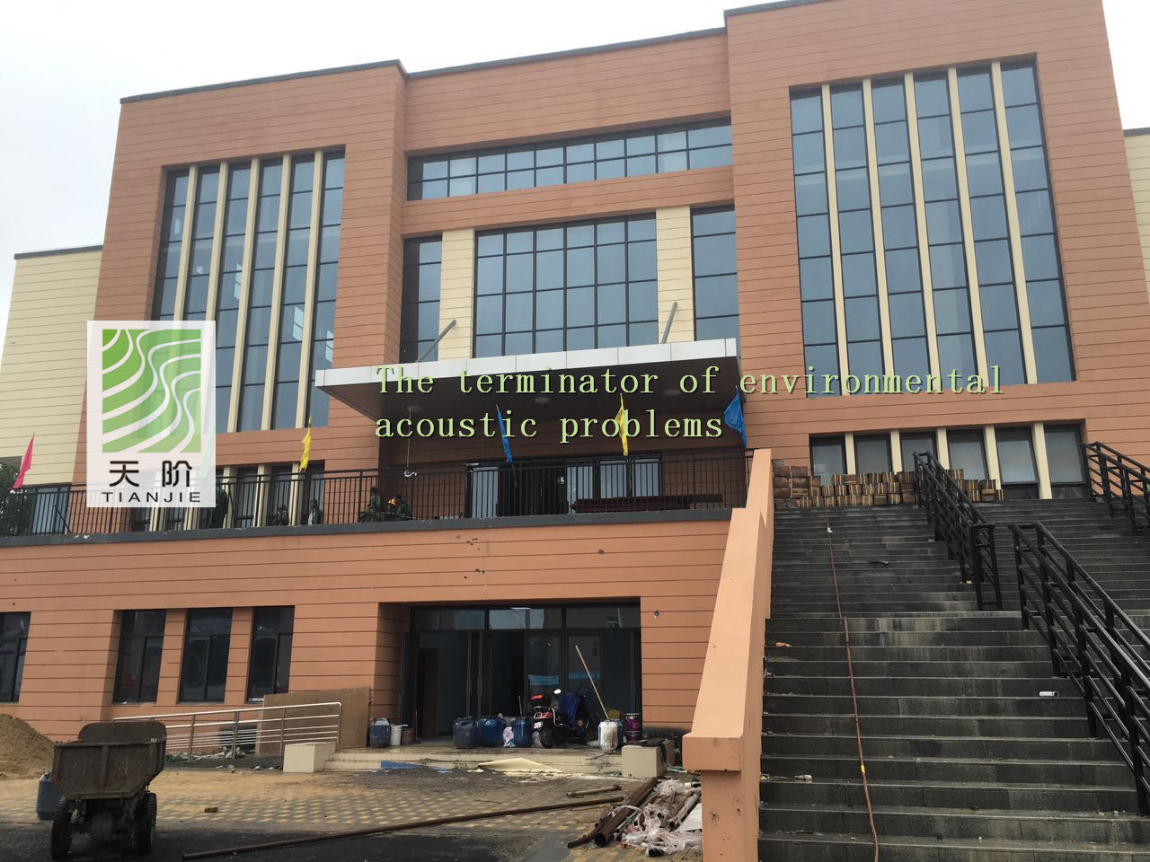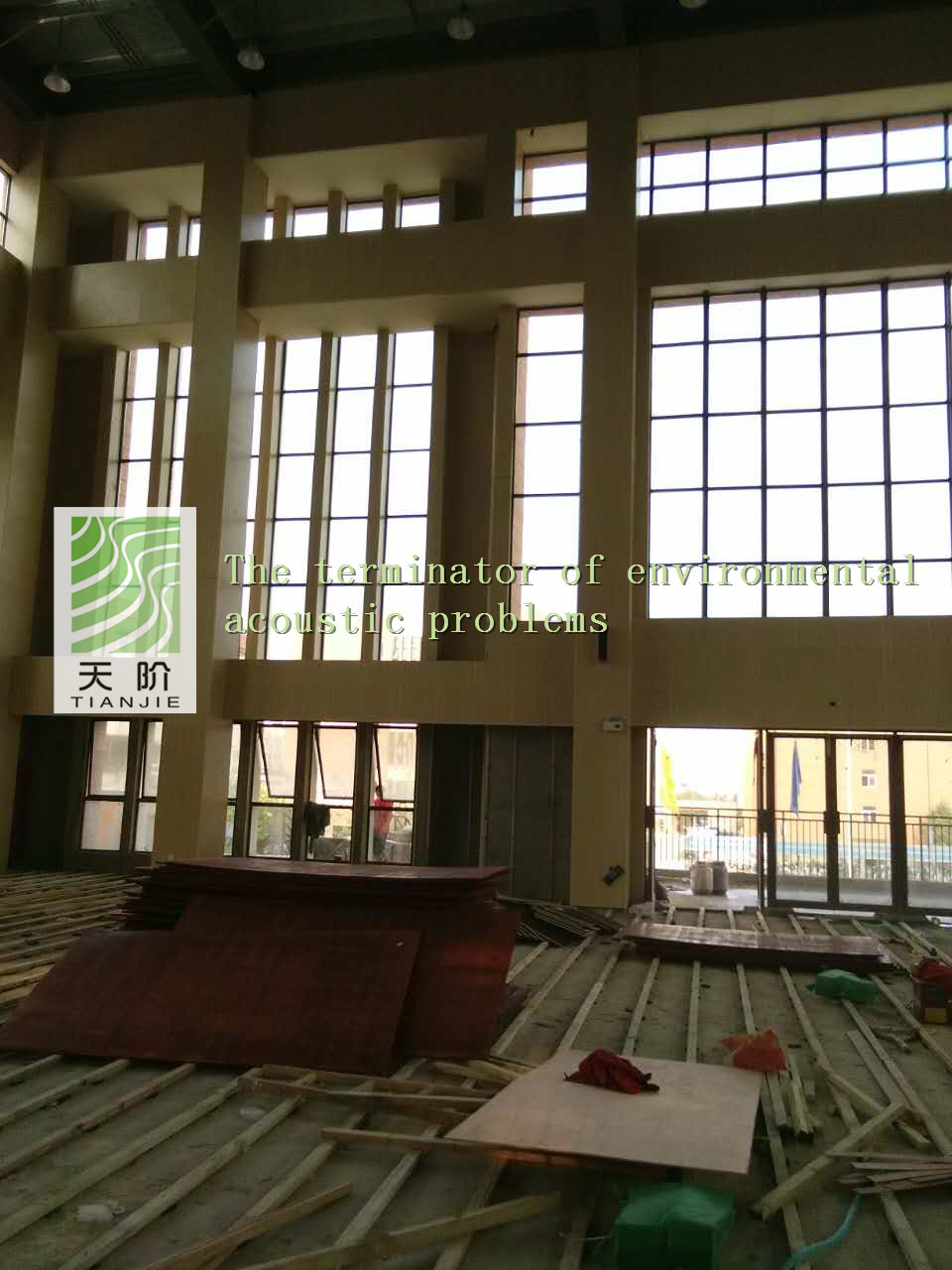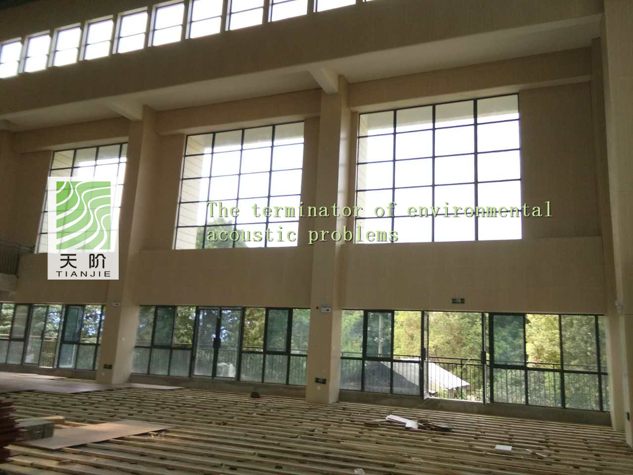此籃球館使用了天階牌槽木吸音板2000平方,吸音棉2000平方。