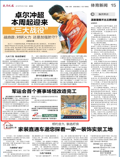 12日,承擔武漢軍運會現(xiàn)代五項擊劍比賽的武漢商學院體育館改造項目順利完工,這是武漢軍運會今年首個完工的場館建設項目,標志著武漢軍運會場館建設取得突破性進展。