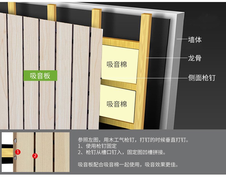 第一層整體木龍骨架主要起支撐與固定的作用,要采用較粗的木龍骨材料,縱橫木龍骨的個數可相對較少。第二層木龍骨架材料較纖細,主要起固定玻璃棉的作用。雙層玻璃棉主要是與100mm空氣間隙共同起到隔音的作用,同時也輔助多孔板吸音。