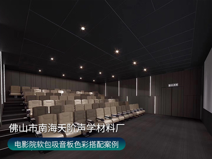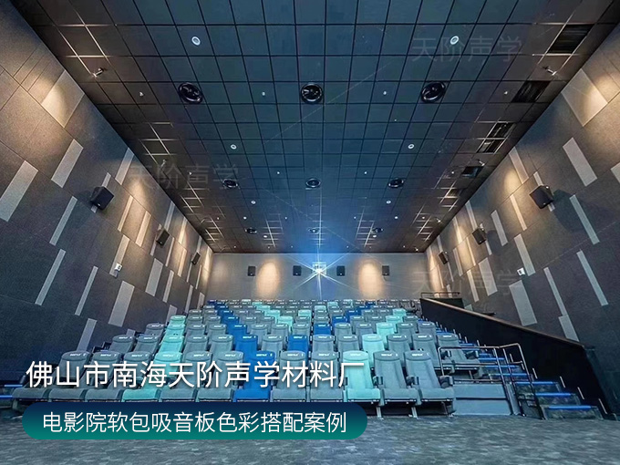 低調高雅的灰色灰色調電影院,墻面選用聚酯纖維吸音板,拼色安裝設計,做不燃處理,舒適又安心,吸收噪音雜音很有效果。