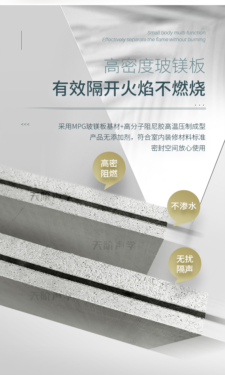 阻尼隔音板采用玻鎂基材,夾加高分子阻尼膠,三文治結構高壓復合成型,形成阻尼復合結構,改變原材質共振頻率,倍數提升原有材質空氣隔聲量和結構隔聲量。