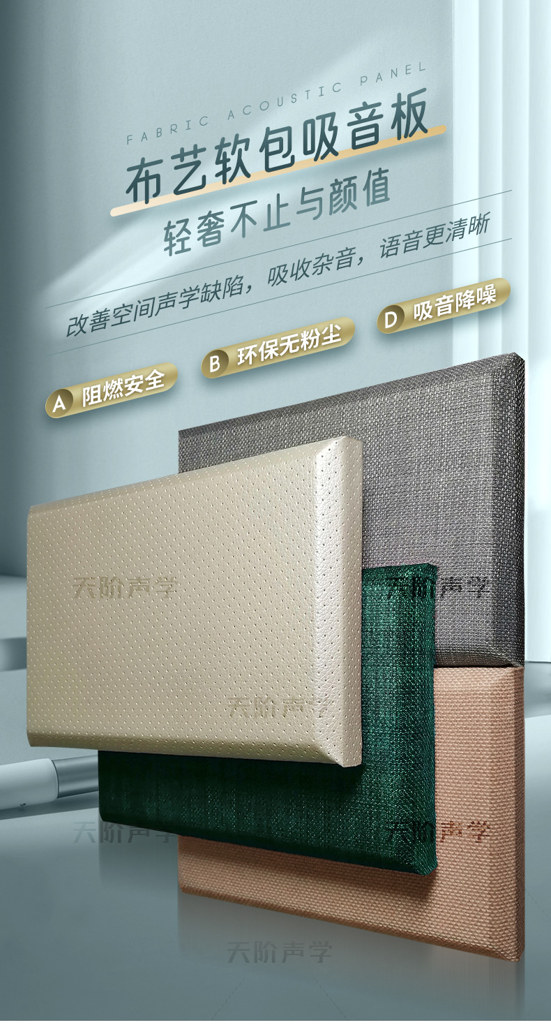 天階聲學布藝吸聲板采用高質的96kg/m3玻璃吸音棉。具有環保、阻燃、吸聲頻帶寬、裝飾性強、施工簡單、無粉塵污染等性能,飾面顏色及材料選擇性廣,能很好地滿足客戶多樣化的聲學及裝飾需求。