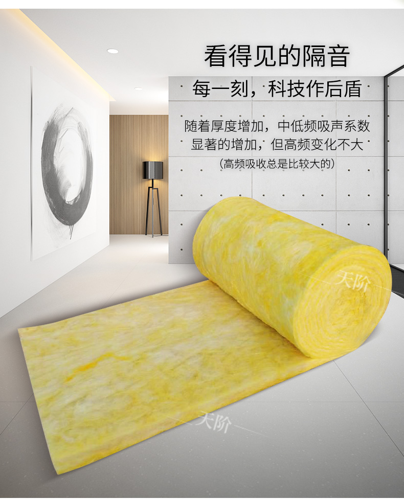 離心玻璃棉內(nèi)部纖維蓬松交錯(cuò),存在大量微小的孔隙,是典型的多孔性吸聲材料,具有良好的吸聲特性。離心玻璃棉可以制成墻板、天花板、空間吸聲體等,可以大量吸收房間內(nèi)的聲能,降低混響時(shí)間,減少室內(nèi)噪聲。