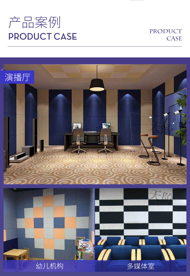 適用場所:歌劇院,影劇院,錄音室,錄音棚,播音室,試音室,電視臺,電臺,商務辦公廳,多功能廳,會議室,演播廳,音樂廳,大禮堂,體育館,休閑娛樂城,酒店,KTV,BAND房,高級別墅或家居生活等對聲學要求較嚴格的場所。