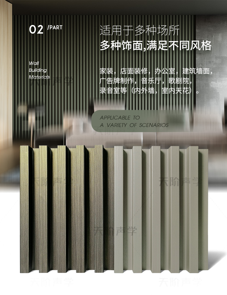 適用場所:家裝,店面裝修,建筑墻面,廣告牌制作,音樂廳,歌劇院,錄音室等(內(nèi)外墻,室內(nèi)天花)。
