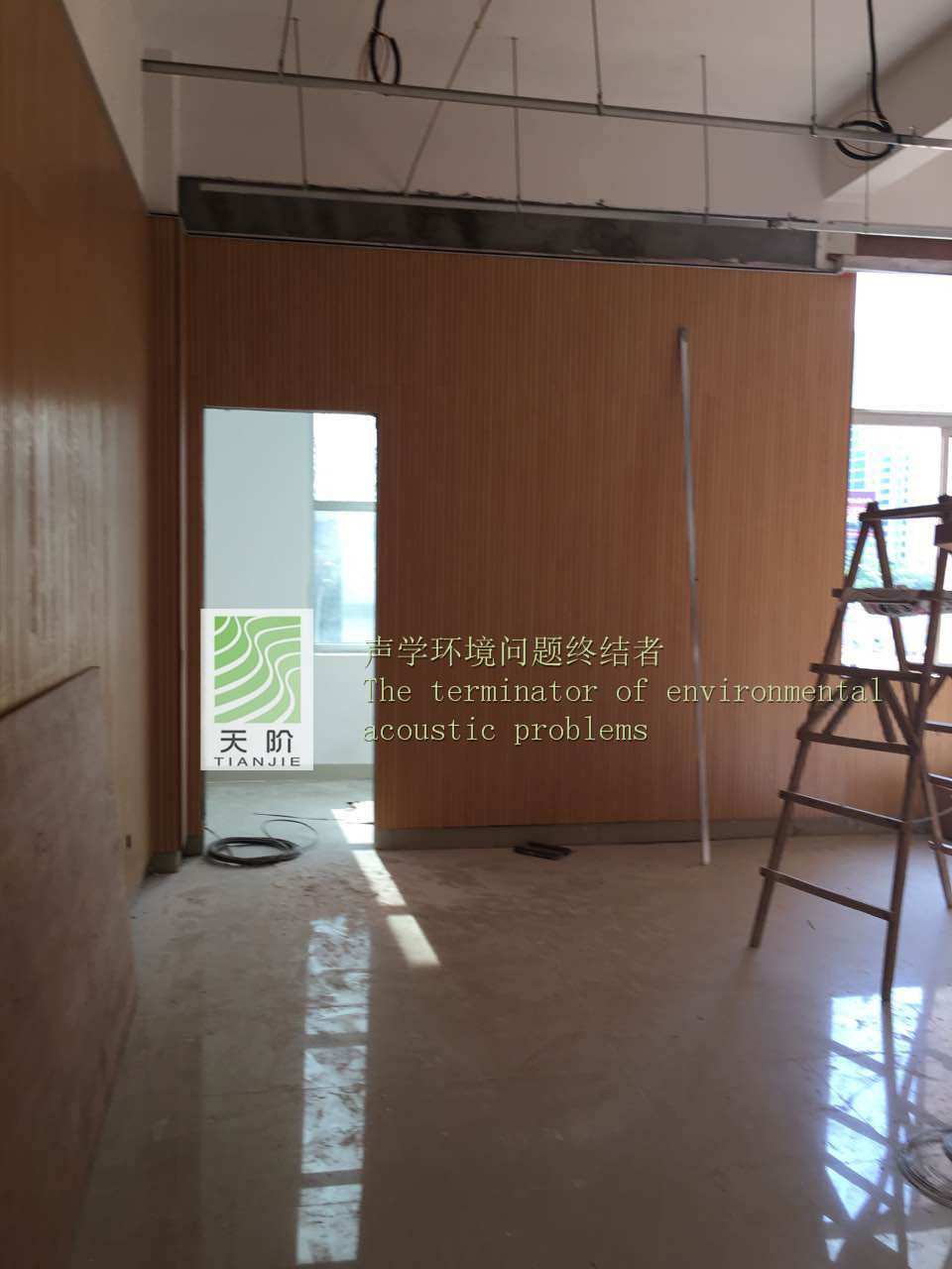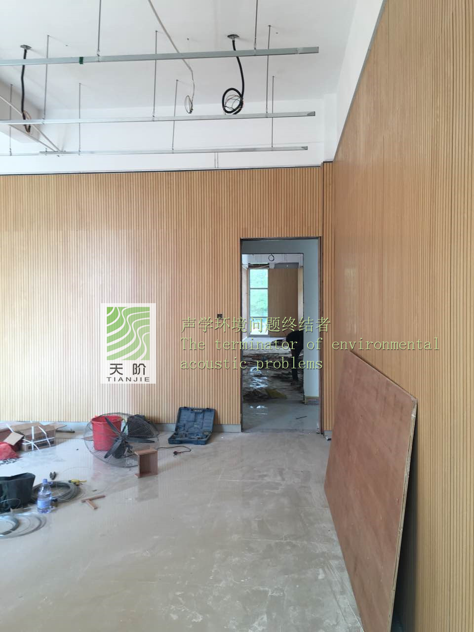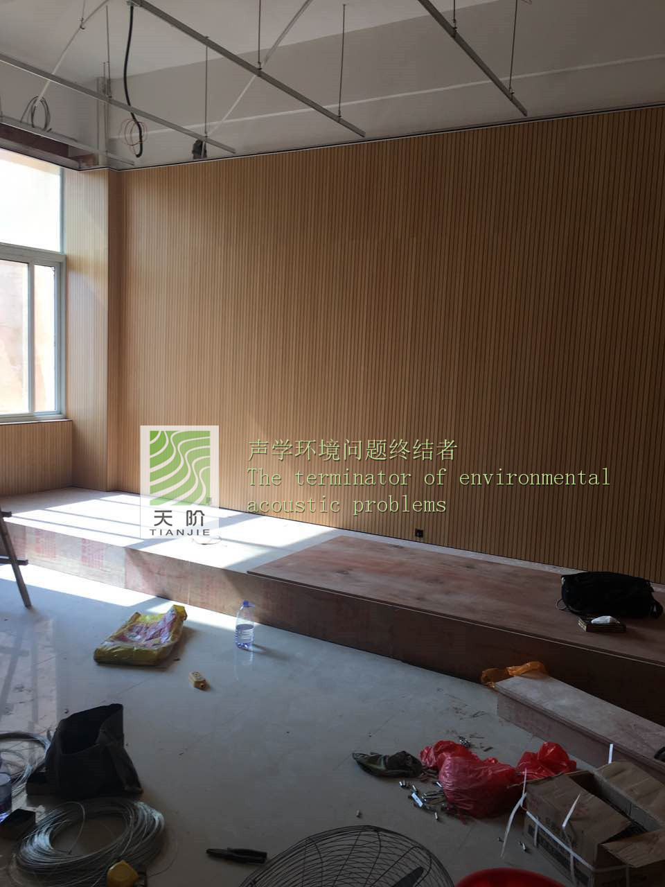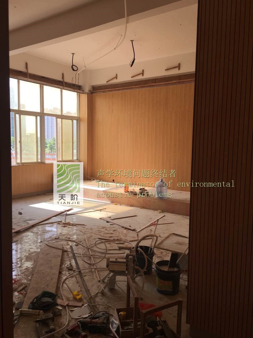 佛山天階吸音板生產廠家 發布日期:2016-10-05 福建省泉州市惠安縣政府對青少年宮非常的重視,特地邀請了專家對舞蹈室、鋼琴室、教室進行了吸音設計。教室的聲學設計應以語言清晰度為主,教室的混響時間長短、背景噪聲、響度對語言清晰度影響最大。不同大小的教室,對混響時間長短的要求會有所不同。教學場所要求較高的語言清晰度,需要較短的混響時間,可以通過室內選用合理的吸音材料和現場裝修布置達到。室內墻面是聲學裝修時面積最大可供利用的表面,所以決定在四周的墻面上安裝槽木吸音板,此時使用了我們天階牌的槽木吸音板共2000平方。