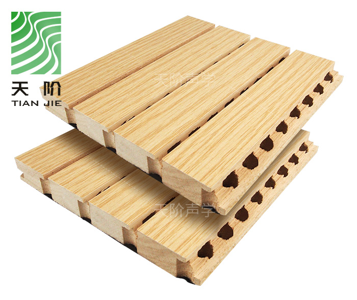 天階聲學材料廠生產的此種天階槽木吸音板由一系列彼此等槽距條組成,通過對槽背面孔徑的大小,深淺,正面槽的寬度,深度以及穿孔率進行嚴格的核算,從而在不同的頻率上取得理想的吸聲效果,有效控制聲波的反射和擴散,消散雜波和噪音,令室骨有合理的混響時間,達到締造音質的吸音效果。