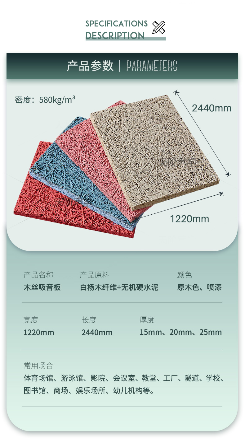 木絲吸音板的表面紋理表現(xiàn)出高雅質(zhì)感與獨特品味,可充分演繹設(shè)計師的創(chuàng)意和理念。該產(chǎn)品結(jié)合了木材與水泥的優(yōu)點:如木材般質(zhì)輕,如水泥般堅固,具有吸音、抗沖擊等多種功能,可廣泛應(yīng)用于體育場館、劇場、影院、會議室、教堂、工廠、學(xué)校、圖書館、游泳館等處。